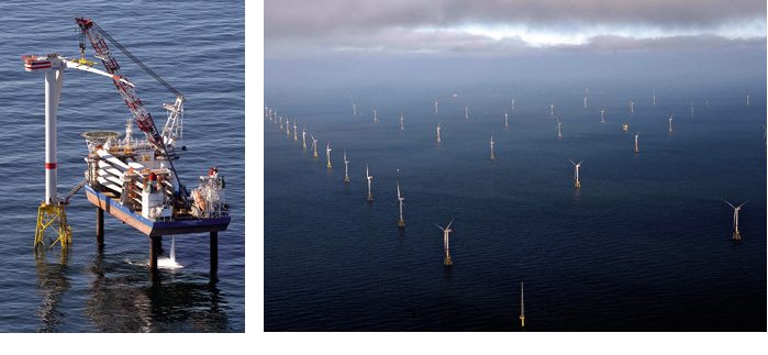 | "Nordsee Ost" ist der sechste Windpark in der deutschen Nordsee, der offiziell die Netzeinspeisung aufgenommen hat. Links wird gerade eine der 6-MW-Windkraftanlagen montiert. Das hundert Meter lange Spezialschiff hat sich dabei durch das Ausfahren von Stahlbeinen in eine Hubinsel verwandelt. Die "Friedrich Ernestine" und das baugleiche Schwesterschiff "Victoria Mathias" hatte der RWE-Konzern eigens für solche Offshore-Montagen bauen lassen. Inzwischen hat er aber beide Schiffe wieder verkauft, um seine Finanznöte zu lindern (130906). Das Foto rechts zeigt den Windpark aus der Vogelschau. Der gelbe Punkt im oberen Drittel ist die Umspannstation, die den von den 48 Anlagen erzeugten Drehstrom bündelt, hochtransformiert und an die HGÜ-Konverterstation Helwin alpha weiterleitet. |