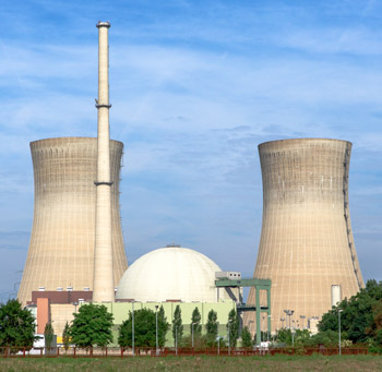 Das KKW Grafenrheinfeld mit dem Reaktorgebäude, den beiden Kühltürmen und dem 160 Meter hohen Abluftkamin. Foto: Wikipedia/Avda