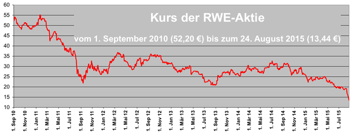 Der Kurs der RWE-Stammaktie hat am 24. August mit 13,44 Euro einen neuen Tiefpunkt erreicht. Er ist damit binnen fünf Jahren um rund drei Viertel geschrumpft. Im Vergleich mit dem absoluten Höchststand, der im Januar 2008 mit bis zu 100 Euro erreicht wurde, ist der Absturz noch wesentlich größer. Eine ähnliche Talfahrt gibt es bei E.ON (siehe Hintergrund). Der Hauptgrund für das Debakel liegt darin, daß RWE und die anderen großen Energiekonzerne viel zu lange auf Atom- und Kohlestrom gesetzt haben (siehe Hintergrund). |