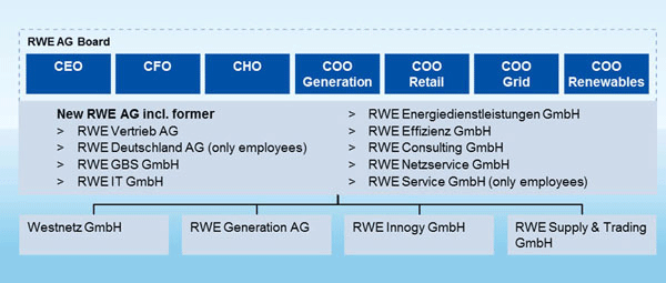 Die Bereiche konventionelle Erzeugung, Erneuerbare Energien und Handel bleiben bis auf weiteres rechtlich eigenständig, werden aber vom jeweils zuständigen Vorstandsmitglied der RWE AG gesteuert. Die RWE Generation SE, die seit Anfang 2013 länderübergreifend für die konventionelle Stromerzeugung zuständig ist, wird jedoch in die RWE Power AG integriert, die dann als RWE Generation AG firmiert. Ferner bleiben die RWE Innogy GmbH und die RWE Supply & Trading GmbH eigene Gesellschaften. Hinzu kommt der Verteilnetzbetreiber Westnetz GmbH, der wegen der gesetzlichen Entflechtungs-Vorschriften nicht einbezogen werden darf.