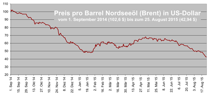 Die Ende Juni 2014 einsetzende Talfahrt der Preise für Rohöl (141101), die bis Anfang dieses Jahres die Preise halbierte (150104), hat nach einem vorübergehenden Anstieg einen neuen Tiefpunkt erreicht. Ende August war Rohöl der Nordsee-Sorte"Brent", das für Europa am wichtigsten ist, mit etwa 43 US-Dollar pro Barrel so billig wie seit über sechs Jahren nicht mehr. Ähnlich war die Preisentwicklung bei den anderen Rohöl-Sorten. Als Schrittmacher fungierte wieder der Opec-Korbpreis, der am 25. August auf 40,47 US-Dollar fiel. Der Preis für die US-Sorte WTI sank sogar unter 40 Dollar.