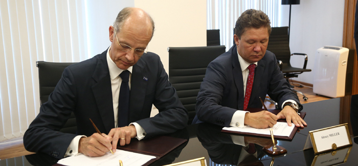 Auf ein Neues: BASF-Chef Kurt Bock und Gazprom-Chef Alexey Miller unterschreiben die Vereinbarung über den Vollzug des vor drei Jahren vereinbarten Tauschgeschäfts, das wegen der Ukraine-Krise gestoppt wurde. Die russische Regie sorgte dafür, daß dieser Akt ebenfalls im Rahmen des ersten "Eastern Economic Forum" in Wladiwostok stattfand, auf dem auch der Konsortialvertrag für die "New European Pipeline AG" unterzeichnet wurde (150905). Foto: Gazprom