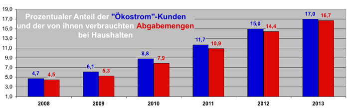 Der "Öko"-Spezialist Lichtblick schluckt damit innerhalb von drei Jahren den vierten Konkurrenten (140410). Vorherige Erwerbungen waren die kommunalen "Ökostrom"-Vertriebe Nordland (Stadtwerke Kiel, Lübeck u.a.), Clevergy (N-Ergie und enercity) und Secura (MVV). In allen drei Fällen handelte es sich um eher notleidende Vertriebe, von denen sich die kommunalen Unternehmen wieder trennen wollten, weil es sich für sie nicht mehr lohnte, spezielle "Ökostrom"-Marken zu pflegen. Ähnlich dürfte es sich mit dem jetzt erworbenen Geschäft von Tchibo verhalten. Daß die Anzahl der "Ökostrom"-Bezieher von Jahr zu Jahr zunimmt (siehe Grafik), ändert nämlich nichts daran, daß sich in diesem Marktsegment nur noch minimale Aufpreise erzielen lassen, von denen dann auch noch die Kosten für die Zertifikate abgehen.