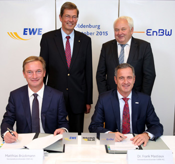 Gütliche Trennung: Der EnBW-Vorstandsvorsitzende Frank Mastiaux und der EWE-Vorstandsvorsitzende Matthias Brückmann unterzeichnen die Vereinbarung zur Beilegung des jahrelangen Streits, der unter ihren Vorgängern Hans-Peter Villis und Werner Brinker entstanden war. Hinter ihnen der EWE-Aufsichtsratsvorsitzende Stephan-Andreas Kaulvers und der Geschäftsführer des EWE-Verbands, Heiner Schönecke (v.l.n.r) Foto: EnBW