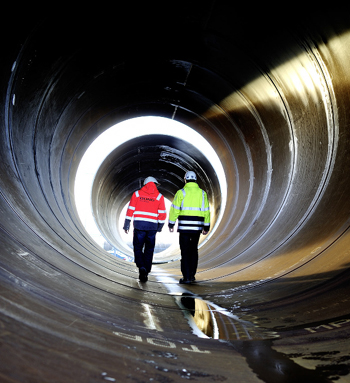 Was auf diesem Foto wie ein Tunnel oder eine gigantische Pipeline aussieht, ist einer der "Monopiles" , auf denen die 78 Windkraftanlagen von Borkum Riffgrund 1 ruhen. Die Stahlpfähle haben einen Durchmesser von nahezu sechs Metern und eine Wandstärke von fünf bis neun Zentimeter. Ihre Länge wird der jeweiligen Wassertiefe angepaßt und variiert zwischen 55 und 65 Meter. Foto: Dong