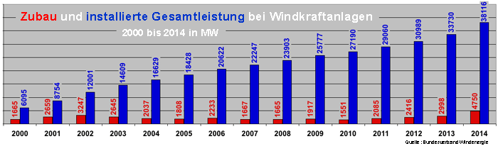 | Mit 4.750 MW erreichte der Zubau von Windkraftanlagen im vergangenen Jahr seinen bisher höchsten Stand. Er übertraf bei weitem den vorgesehenen "Korridor" von 2.400 bis 2.600 MW – im Gegensatz zur Entwicklung bei den Solaranlagen, für die derselbe Korridor gilt, die aber mit 1.437 MW weit unter dem offiziell erwünschten Zubau blieben (151105). |