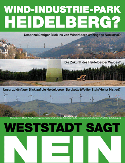 Inzwischen regt sich in den gut für Solaranlagen geeigneten, aber eher windarmen Gebieten Süddeutschlands allenthalben Widerstand gegen die vermehrte Ausweisung von Vorranggebieten für die Errichtung von Windkraftanlagen. So haben sich allein im Odenwald 17 Bürgerinitiativen gebildet, die gegen die "Verspargelung" des waldreichen Mittelgebirges protestieren, das sowohl in Hessen als auch in Baden-Württemberg den Status eines "Naturparks" besitzt. Neben der optischen Beeinträchtigung des Landschaftsbildes kritisieren die Initiativen die Abholzung großer Baumbestände, die zur Schaffung geeigneter Bauplätze und Zufahrtswege erforderlich wäre. Eine Forderung lautet, zumindest den Kamm des Gebirges von Windkraftanlagen freizuhalten, wie dies auf der anderen Seite des Oberrheintals der Fall ist, wo die Haardt und die nördlich anschließende Randzone des Pfälzer Walds zu Ausschlußgebieten erklärt wurden. In Heidelberg empört vor allem eine Fotomontage, die beim Blick nach Osten die vertraute Kulisse mit Stadt, Neckar und Alter Brücke durch mehrere deutlich sichtbare Windkraftanlagen auf den Höhen des Odenwalds ergänzt. Die Simulation stammt nicht etwa von Windkraftgegnern, sondern von dem für die Planung zuständigen Nachbarschaftsverband Rhein-Neckar.