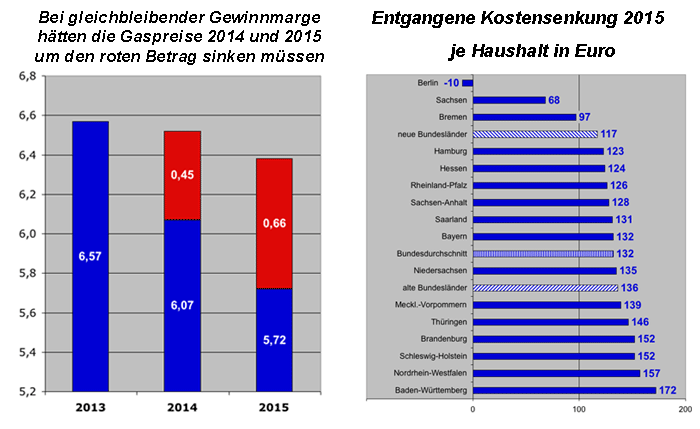 Die Senkung des Gaspreises um 0,66 Cent pro Kilowattstunde, die 2015 möglich gewesen wäre (links), gilt für den durchschnittlichen Bundeshaushalt mit einem Verbrauch von 20.000 kWh und entspräche einer jährlichen Einsparung von 132 Euro. In den einzelnen Bundesländern sind aber die Gaspreise und damit auch die entgangenen Kostensenkungen sehr unterschiedlich, wie die Grafik rechts zeigt. |