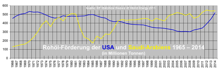 Das änderte sich ab etwa 2006, als die seit 1985 kontinuierlich gesunkene einheimische Förderung der USA wieder Auftrieb erhielt, weil immer größere Mengen an Schieferöl gefördert wurden, die den Rückgang der einheimischen Förderung mehr als kompensierten. Ermöglicht wurde dies durch den mittlerweile erreichten Rekordstand von mehr als 60 Dollar pro Barrel, der bis 2008 sogar die 100-Dollar-Grenze erreichte. Damit wurde die Erschließung von Schieferöl mittels der teuren (und umweltgefährdenden) "Fracking"- Technik, die sich sonst nicht gelohnt hätte, ein rentierliches Geschäft. Die USA produzierten nun sogar soviel Öl, daß ab 2010 die US-Sorte WTI deutlich billiger war als die Opec-Sorte Dubai Fateh, die bis dahin den unteren Rand der Preisgrenze markiert hatte (siehe Grafik).