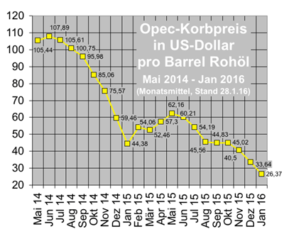 Auch für andere Ölproduzenten war der Preisverfall kein Grund, die Förderung zu verringern. Eher wurde diese noch ausgeweitet. Das gilt vor allem für Rußland, das neben Saudi-Arabien der größte Öl-Anbieter am Weltmarkt ist. Da die Staatseinnahmen größtenteils aus dem Verkauf der Rohstoffe Öl und Gas bestehen, wird der Kreml vom Preisverfall des Öls noch wesentlich härter getroffen als durch die Sanktionen wegen seiner Ukraine-Politik. Während der Euro Anfang Herbst 2015 noch für rund 50 Rubel zu haben war, kostete er Ende Januar 2015 fast 80 Rubel. Nach einer vorübergehenden Erholung kletterte der Wechselkurs im Januar 2016 bis auf fast 90 Rubel für einen Euro.