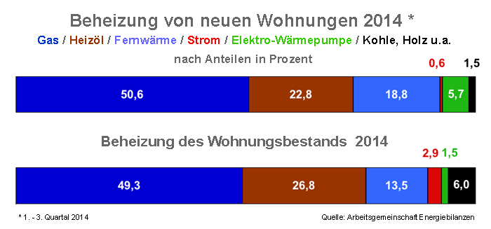 Die reine Elektroheizung hatte 2014 bei neuen Wohnungen nur noch einen Anteil von 0,6 Prozent gegenüber 2,9 Prozent beim gesamten Wohnungsbestand. Sie ist also auf dem Rückzug. Zugleich werden aber immer mehr Neubau-Wohnungen mit Elektro-Wärmepumpen ausgestattet. Insgesamt erhöht sich so der Anteil des Stroms bei der Beheizung von Wohnungen. |