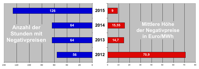 Die Zahl der Stunden mit negativen Preisen an der Strombörse hat sich 2015 gegenüber den drei Vorjahren verdoppelt: Während sie seit 2012 jährlich zwischen 56 und 64 betrug (140608), waren es im vergangenen Jahr 126 Stunden. Zugleich ging die durchschnittliche Höhe der negativen Strompreise deutlich zurück: Während beispielsweise 2012 der Durchschnittswert der 56 Stunden mit negativen Preisen bei minus 60,51 Euro pro Megawattstunde lag, waren es 2015 nur noch minus 9 Euro (siehe Grafik).