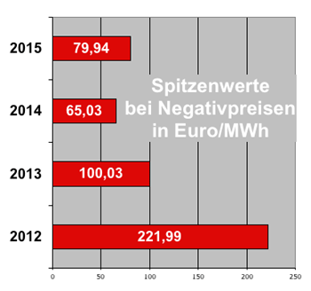 Die Marktteilnehmer haben 2015 flexibler auf negative Preise an der Strombörse reagiert. Sie erreichten damit aber nur eine Umschichtung von weniger Stunden mit höheren Negativpreisen zu mehr Stunden mit geringeren Negativpreisen. Das Mißverhältnis zwischen Angebot und Nachfrage, das die negativen Strompreise hervorbringt, wurde damit nicht beseitigt. Dieses Problem kann erst gelöst werden, wenn die Erzeugung der konventionellen Kraftwerke elastischer als bisher der Einspeisung aus erneuerbaren Stromquellen angepaßt wird. |