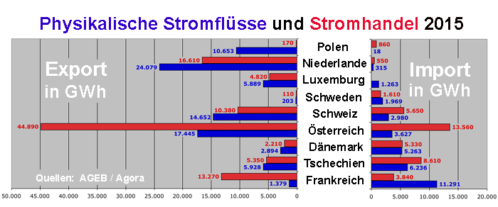 Der physikalische Stromaustausch mit dem Ausland wird an den jeweiligen Grenzkuppelstellen der Netze gemessen und entspricht insgesamt etwa den Strommengen, die mit den europäischen Nachbarstaaten gehandelt werden. Die einzelnen Stromlieferungen nehmen aber nicht unbedingt den kürzesten Weg über die Grenze, sondern suchen sich ihre eigenen Wege durch das europäische Verbundnetz. Zum Beispiel waren 2015 die mit Österreich und Frankreich gehandelten Strommengen wesentlich größer als die an den Grenzen registrierten physikalischen Stromflüsse. Im Falle der Niederlande und der Schweiz verhielt es sich umgekehrt. Die Stromflüsse nach Polen erfolgten sogar so gut wie ohne Stromhandelsverträge mit diesem Land und dürften hauptsächlich in Österreich verbraucht worden sein. |