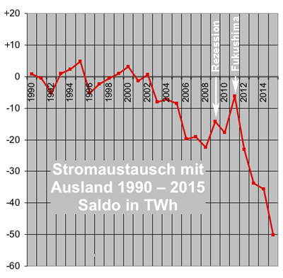 Deutschland verkauft demnach 10 Prozent der Stromproduktion ins Ausland (Handelssaldo) beziehungsweise produziert 8 Prozent Strom mehr Strom, als es verbraucht (physikalischer Saldo). Diese Differenz zwischen Erzeugung und Verbrauch ist in den vergangenen Jahren konstant angestiegen – während der Stromaustauschsaldo im Jahr 2000 noch ungefähr ausgeglichen war, öffnet sich die Schere zwischen Stromerzeugung und Stromverbrauch seither immer weiter (siehe Grafik).