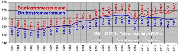 Einer Bruttostromerzeugung von 647,1 TWh stand im vergangenen Jahr ein Bruttostromverbrauch von 597 TWh gegenüber. Die Kraftwerke produzierten also 50,1 TWh mehr, als verbraucht werden konnte. So groß war die Differenz noch nie, seitdem die Liberalisierung des Strommarktes dem früher fast identischen Verlauf der beiden Kurven ein Ende setzte. Sie entspricht dem Exportüberschuß beim physikalischen Stromaustausch mit dem Ausland. |