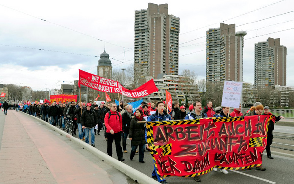 Nachdem der neue Eigentümer General Electric die Schließung des Kraftwerksbereichs bekanntgegeben hatte, zogen 1.200 Alstom-Beschäftigte protestierend durch Mannheim. |