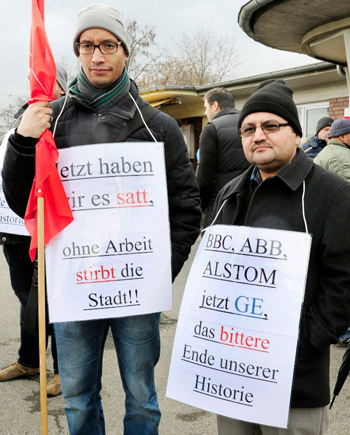 Der Betriebsrat in Mannheim sah sich zunächst nur durch die Abgabe von Serviceverträgen betroffen, die ebenfalls zu den Auflagen der Kommission gehörten. Er wertete die Übernahme sogar als Chance, da die Amerikaner einen größeren Marktzugang hätten. Nachdem die Stellenstreichungen bekannt wurden, zogen am 14. Januar rund 1.200 Beschäftigte protestierend durch die Straßen der Stadt. Ein Sprecher der IG Metall übersetzte die Buchstaben GE – unter Anspielung auf eine derzeit laufende Werbekampagne des Konzerns – mit "gierig und einfallslos". Die Konzernbetriebsratsvorsitzende Elisabeth Möller bezeichnete die Ankündigungen des GE-Managements als "Schlag ins Gesicht für alle Beschäftigten". Sie bedeuteten das endgültige Aus für die Turbinenfabrik und damit den gesamten Produktionsstandort Mannheim.