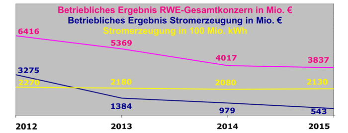 Die Ertragslage des RWE-Konzerns hat sich im vergangenen Jahr weiter verschlechtert. Dies ergibt sich aus dem Geschäftsbericht 2015, den er am 8. März vorlegte. Bei der konventionellen Stromerzeugung ist das betriebliche Ergebnis um 45 Prozent auf 543 Millionen Euro geschrumpft, während das Konzernergebnis um 4,5 Prozent auf 3.837 Millionen Euro zurückging (siehe Grafik). Als Hauptgrund nannte RWE die andauernde Flaute bei den Großhandelspreisen, die durch günstigere Preise beim Einkauf von Steinkohle und anderen Brennstoffen nur in geringem Maße kompensiert worden sind. Da immer mehr alte Stromlieferverträge auslaufen, die noch zu günstigeren Preisen abgeschlossen wurden, rechnet RWE auch für 2016 mit einer Fortsetzung der Talfahrt und einem betrieblichen Konzernergebnis zwischen 2,8 und 3,1 Milliarden Euro.