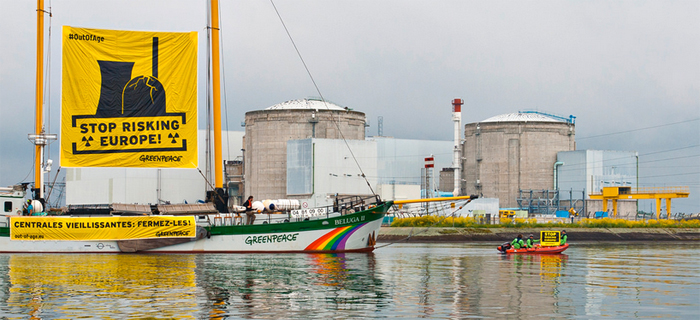Das KKW Fessenheim liegt am Rheinseitenkanal "Grand Canal d'Alsace", nur einen Kilometer von der deutschen Grenze entfernt. Es ist weder gegen Erdbeben noch gegen Überflutung hinreichend gesichert. Die anlageninternen Wasserschäden, die seit 2014 zweimal wichtige Sicherheitssysteme außer Funktion setzten, vermitteln einen schwachen Vorgeschmack auf das, was bei einem Bruch des Kanaldamms passieren könnte. Foto: Greenpeace