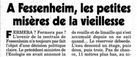 Fessenheim ist das älteste französische Kernkraftwerk und liegt nur einen Kilometer von der deutschen Grenze entfernt. Aufgrund diverser Pannen ist es wiederholt grenzüberschreitend in die Kritik geraten. Bei der vorherrschenden Windrichtung von West nach Ost würde ein schwerer Störfall mit Freisetzung von Radioaktivität hauptsächlich Deutschland treffen (was auch für andere französische Kernkraftwerke sowie für die Reaktoren in Belgien und den Niederlanden gilt). Das Kernkraftwerk ist nur unzureichend gegen Erdbebengefahr geschützt. Falls der Damm des Rheinseitenkanals bricht, aus dem es sein Kühlwasser bezieht, könnte es überflutet werden.