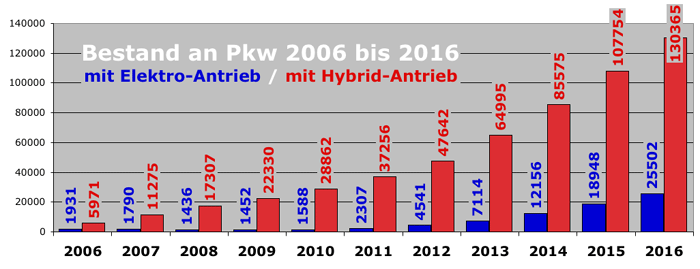 In den zehn Jahren seit 2006 ist die Zahl der Elektro-Pkw auf deutschen Straßen um das zwanzigfache gestiegen. Beim Vergleich mit dem Gesamtbestand von insgesamt über 45 Millionen Pkw ergeben diese 155.867 Fahrzeuge aber nur einen sehr bescheidenen Anteil von 0,35 Prozent. Außerdem handelt es sich größtenteils um Hybrid-Fahrzeuge (rot), die sowohl einen Verbrennungsmotor als auch einen Elektromotor unter der Haube haben. Reine Elektro-Pkw (blau) erreichen gerade mal 0,06 Prozent am Gesamtbestand. Quelle: Kraftfahrtbundesamt