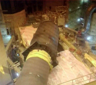 Da war es schon vorbei: Das Umkippen des 22 Meter hohen Dampferzeugers und sein Aufschlagen auf dem Reaktorbehälter wurde vom KKW-Personal zwar am Bildschirm verfolgt, aber nicht aufgezeichnet. |