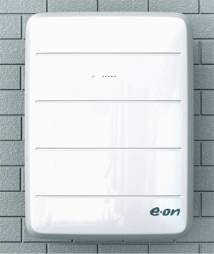 E.ON begann am 7. April mit dem Vertrieb eines Stromspeichers für den Hausgebrauch. Das Angebot wendet sich an die Besitzer von kleinen Solaranlagen, die den erzeugten Strom bisher größtenteils ins Netz einspeisen, weil Erzeugung und Eigenbedarf zeitlich auseinanderfallen. Der Lithium-Ionen-Akkumulator "E.ON Aura" ermöglicht es ihnen, den Eigenverbrauch vom tageszeitlichen Verlauf der Solarstromerzeugung zu entkoppeln. Er hat eine Kapazität von 4,4 Kilowattstunden. Nach Angaben von E.ON läßt sich damit der Stromanteil, der selbst erzeugt und verbraucht wird, von etwa einem Drittel auf siebzig Prozent steigern. Bei Bedarf kann die Kapazität des Speichers um jeweils 2,2 Kilowattstunden bis auf 11 Kilowattstunden erweitert werden.