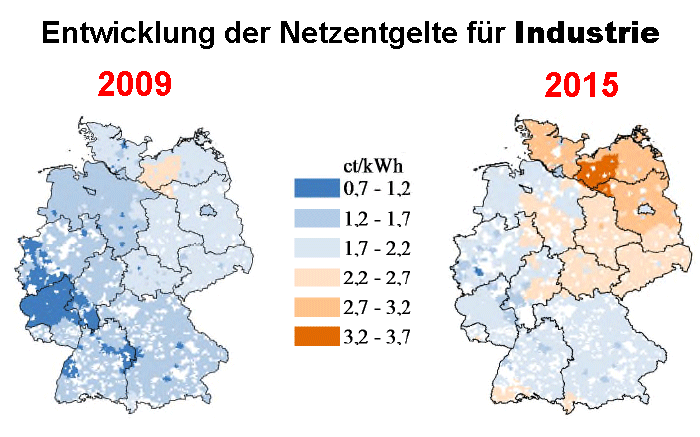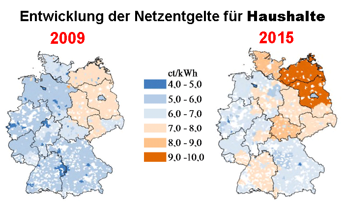 Im Jahr 2009 wurde ein deutscher Haushaltskunde mit durchschnittlich 5,80 Cent/kWh für die Netzentgelte belastet. In den alten Bundesländern war die Belastung aber überwiegend geringer, während sie in den neuen Bundesländern fast durchweg höher war (links). Daran hat sich auch sechs Jahre später prinzipiell nichts geändert (rechts). Auffällig ist aber der besonders starke Anstieg der Netzentgelte in den ostdeutschen Bundesländern Mecklenburg-Vorpommern, Brandenburg und Thüringen sowie in Schleswig-Holstein. Der Hauptgrund dafür ist der Zubau von Windkraftanlagen und anderen regenerativen Stromquellen, deren Einspeisung nach der gegenwärtigen Regelung rechnerisch zu "vermiedenen Netzentgelten" führt und damit für die Verbraucher erhöhte Netzkosten bewirkt. Quelle: BNA-Bericht zur Netzentgeltsystematik