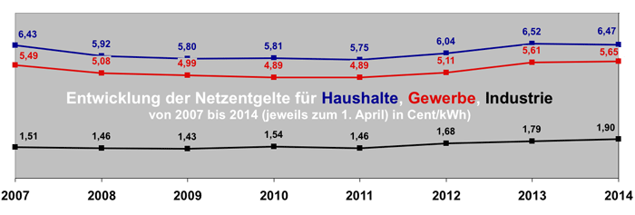 Netzentgelte besonders hoch (blau). Etwas weniger zahlen gewerbliche Niederspannungskunden,