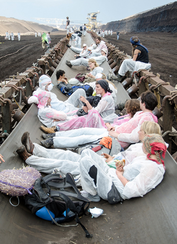 Vattenfall hatte den Tagebaubetrieb bereits gestoppt, als diese Demonstranten es sich auf einem Förderband bequem machten. |