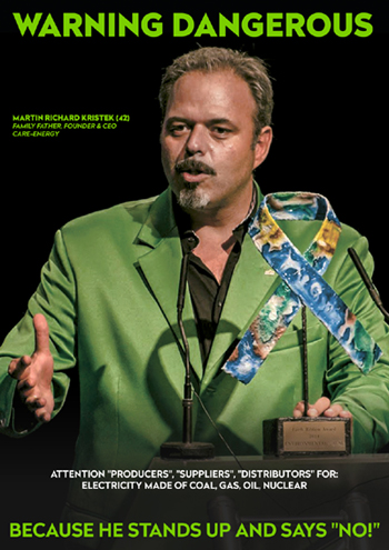 Auf diesem Plakat warnt der Chef des Stromvertriebs Care-Energy vor sich selber. Die Warnung ist allerdings nicht an seine Kunden gerichtet. Kristek präsentiert sich vielmehr in der Rolle des Volkstribuns, der die etablierte Energiewirtschaft herausfordert. Foto: obs/mk-group Holding GmbH/Care