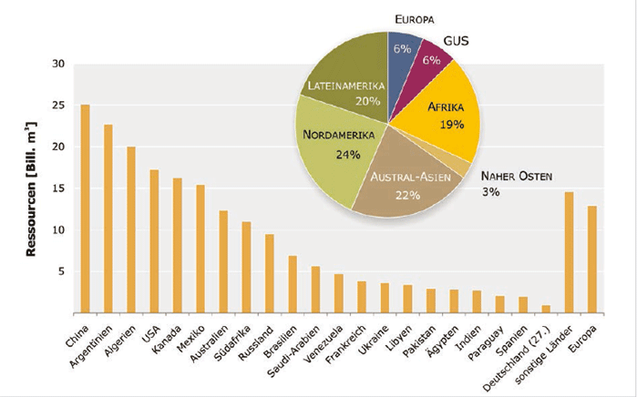 Die deutschen Schiefergas-Ressourcen rangieren im internationalen Vergleich erst an 27. Stelle. Sie sind aber groß genug, um auch hierzulande die Begehrlichkeit von Gasförderern wie Exxon (141009) zu wecken. Die Lobby argumentiert dabei gern mit der unbedeutenden inländischen Gasförderung, deren anhaltender Rückgang per Fracking zumindest kompensiert werden könne. Grafik: Bundesanstalt für Geowissenschaften