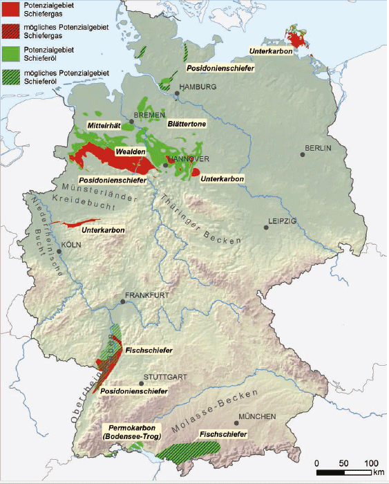 Niedersachsen verfügt von allen Bundesländern über das größte Potential für die Förderung von Schiefergas (grün) oder Schieferöl (rot) per Fracking. Grafik: Bundesanstalt für Geowissenschaften