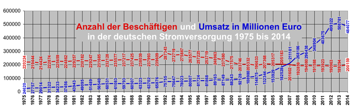 Der Umsatz der Branche (blaue Kurve) stieg dagegen seit 1975 kontinuierlich. Von 2002 bis 2012 hat er sich sogar mehr als vervierfacht. Die üblichen umsatzsteigernden Faktoren (Produktionszuwachs, Preiserhöhungen, Inflation usw.) reichen in keiner Weise aus, um diese Steigerung zu erklären. Vermutlich hat sie mit der fortschreitenden juristischen Entflechtung des Netzbetriebs von Erzeugung und Vertrieb zu tun, denn im selben Zeitraum erhöhte sich die Anzahl der statistisch erfaßten Unternehmen (ab 20 Beschäftigte) von 610 auf 757. (Grafik vergrößern) |