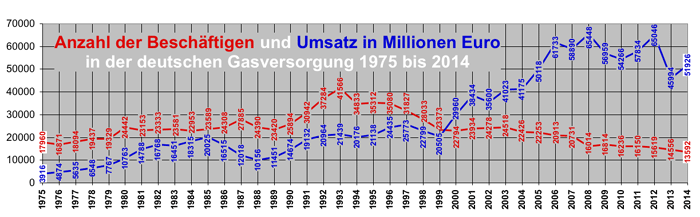 | In der Gasversorgung sind die Zahlen für Beschäftigte und Umsatz ungefähr zehnmal niedriger als in der Stromversorgung. Aber auch hier kam es durch die Wiedervereinigung zu einem starken Zuwachs an Arbeitsplätzen, der im folgenden Jahrzehnt unter das Ausgangsniveau zurückfiel, um dann fast kontinuierlich weiter abzusinken. Die Umsatz-Explosion setzt hier bereits 2000 ein und nimmt einen etwas anderen Verlauf als bei der Stromversorgung. Sie dürfte aber ebenfalls mit der Entflechtung der Netzbetreiber vom Vertriebsbereich zusammenhängen, denn zugleich stieg die Zahl der statistisch erfaßten Unternehmen bis 2014 von 60 auf 85. (Grafik vergrößern) |