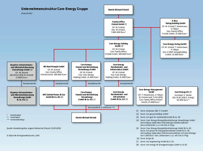 Der Bund der Energieverbraucher hat sich die Mühe gemacht, zumindest die wesentlichen Handelsregister-Eintragungen des Firmengeflechts nachzuzeichnen, das unter der Marke Care-Energy firmiert und von dem Österreicher Martin Richard Kristek dirigiert wird. In dieser neuesten Version ist der Verkauf der beiden "Expertos"-Firmen (links) mit ihren schätzungsweise 90 Millionen Euro Schulden bereits berücksichtigt. Die "Care-Energy AG" dagegen (rechts unten), die bis vor kurzem angeblich eigenständig war und deshalb separat aufgeführt wird, gehört inzwischen ebenfalls offiziell Kristek. Gegen beide Firmen laufen Aufsichtsverfahren der Bundesnetzagentur.