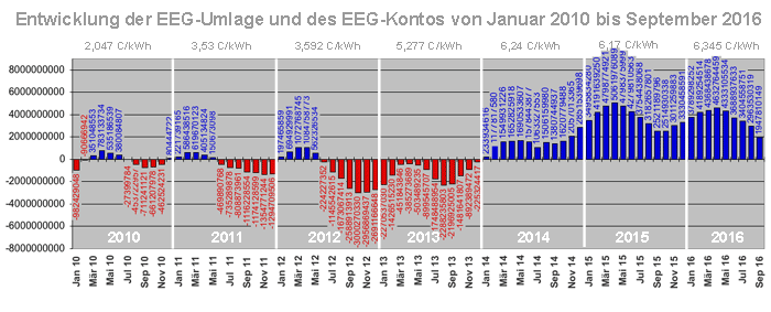 In diesem Jahr kam es zu einer weiteren Erhöhung der EEG-Umlage auf 6,345 Cent/kWh (151006). Sie sorgte dafür, daß das Konto auch 2016 über alle Monate hinweg erhebliche Überschüsse aufwies. Allerdings wurden diese tendenziell kleiner. Neben den gestiegenen Förderkosten lag dies an den weiter gesunkenen Großhandelspreisen, welche die ohnehin mageren Erlöse aus dem Verkauf des EEG-Stroms an der Börse zusätzlich schmälerten. Die Initiative Agora Energiewende ermittelte deshalb bereits im Juli, daß die EEG-Umlage 2017 voraussichtlich auf über 7 Cent/kWh angehoben werden müsse (160703).