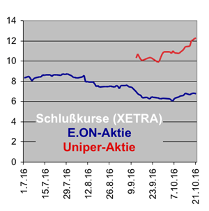 Die Aktie der neuen E.ON-Tochter Uniper wird seit 12. September an der Frankfurter Wertpapierbörse gehandelt. Während sie am Eröffnungstag mit 10,3 Euro aus dem Handel gegangen war, legte sie bis Ende Oktober um bis zu zwei Euro zu. Im selben Zeitraum sank allerdings die E.ON-Aktie von zuletzt 7,42 auf bis zu 6,08 Euro, um sich dann bis Ende Oktober auf 6,71 Euro wieder zu erholen. Generell verläuft die Aufspaltung des alten Geschäftsbereichs bei E.ON bisher nicht so erfolgreich wie beim RWE-Konzern, der am 7. Oktober nachzog und seine neue Tochter Innogy an die Börse brachte (161002).