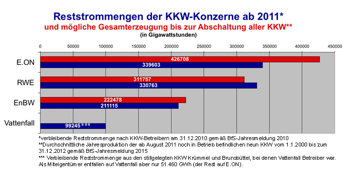 Der Konzern hat eben erst seine 13 Braunkohle-Kraftwerksblöcke in Ostdeutschland gegen Aufgeld verschenkt (160401). Die beiden KKW, denen damals die Betriebserlaubnis entzogen wurde, dürften einen ähnlichen Marktwert gehabt haben. Unter Berücksichtigung der Entsorgungslasten wäre er sie wahrscheinlich auch ohne Entzug der Betriebserlaubnis nur gegen ein Milliarden-Aufgeld losgeworden. Von einer enteignungsähnlichen Maßnahme nach Artikel 13 der Energie-Charta kann schon deshalb nicht die Rede sein, weil ihm neben dem Eigentum an beiden Anlagen die noch nicht abgearbeiteten Reststrommengen verblieben, die er an jeden anderen KKW-Betreiber in Deutschland verkaufen kann. Als Verwerter käme vor allem der langjährige Geschäftspartner E.ON in Betracht, der an Krümmel mit 50 Prozent und an Brunsbüttel mit 33,3 Prozent beteiligt ist (siehe Grafik und Hintergrund).