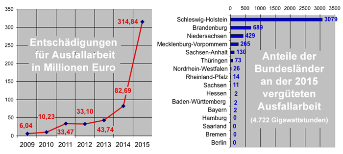 Immer häufiger werden EEG-Anlagen aus netztechnischen Gründen abgeregelt, obwohl sie bei der Einspeisung ins Stromnetz grundsätzlich den Vorrang haben vor konventionellen Kraftwerken. Die Betreiber erhalten dann zwar keine EEG-Förderung, aber nach § 15 Abs. 1 EEG eine Entschädigung für die "Ausfallarbeit". Diese geht in die Netzkosten ein und belastet auf diese Weise die Letztverbraucher. Bis 2014 waren die so entstehenden Kosten auf 82,7 Millionen Euro geklettert. Schon vor einem Jahr zeichnete sich ab, daß sie 2015 mehr als doppelt so hoch sein würden (151201). Tatsächlich sind die Auszahlungen aber sogar auf rund 315 Millionen Euro gestiegen (siehe Grafik). Sie haben sich also fast vervierfacht, während die Ausfallarbeit von 1.581 auf 4.722 Gigawattstunden zunahm und damit fast drei Mal so hoch wie im Vorjahr war. Dies ergibt sich aus dem "Monitoringbericht 2016", den am 30. November die Bundesnetzagentur und das Bundeskartellamt veröffentlichten.