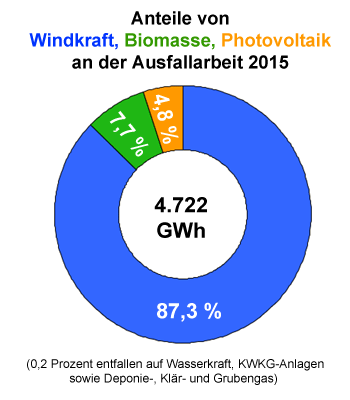 Den größten Anteil an der 2015 entstandenen Ausfallarbeit hatten mit 87,3 Prozent wiederum die Windkraftanlagen (im Vorjahr 77,3 Prozent). Erstmals waren auch Offshore-Anlagen vom "Einspeisemanagement" betroffen. Ihr Anteil betrug allerdings nur 0,3 Prozent (rund 16 GWh) an der Gesamtausfallarbeit. Am zweithäufigsten wurden mit einem Anteil von fast acht Prozent Biomasse-Anlagen abgeregelt. Die Photovoltaik-Anlagen, die 2014 noch mit rund 16 Prozent an zweiter Stelle folgten, kamen dagegen nur noch auf einen Anteil von rund fünf Prozent an der Gesamtausfallarbeit (siehe Grafik).