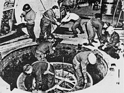 Amerikaner beim Ausräumen der "Uranmaschine", mit der deutsche Physiker 1945 in einem Felsenkeller in Haigerloch vergebens versucht hatten, eine Kettenreaktion in Gang zu bringen. Hauptziel war dabei die Gewinnung von Plutonium für den Bau einer Atombombe. |