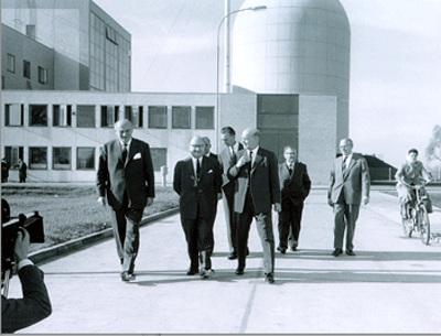 In Kahl am Main ging 1960 der erste deutsche Leichtwasser-Reaktor in Betrieb. Die Anlage wurde noch ganz unbefangen als "Versuchsatomkraftwerk" bezeichnet. Das Foto zeigt den "Atomminister" Siegfried Balke bei der Besichtigung. Später war offiziell nur noch von Kernkraftwerken oder Kernenergie die Rede, und das Atomministerium verwandelte sich in das Forschungsministerium. |
