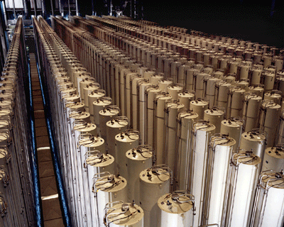Uran-Zentrifugen sind längliche Zylinder, die mit Uranhexafluorid gefüllt werden und mit unvorstellbarer Geschwindigkeit im Vakuum rotieren. Das leichtere Uran 235 konzentriert sich dabei am oberen Ende und das schwerere U 238 am unteren Ende. |
