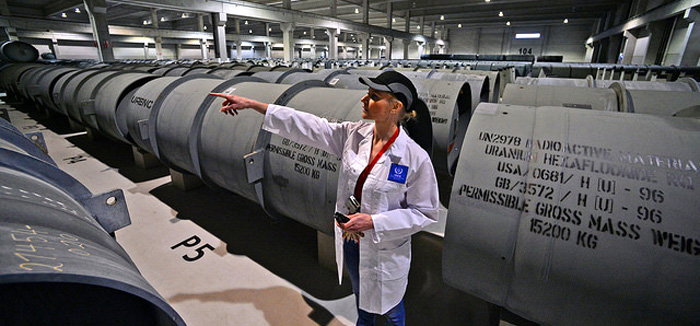 Eine Inspektorin der Internationalen Atomenergie-Organisation (IAEO) überprüft Behälter mit Uranhexafluorid in der niederländischen Anlage Almelo. |