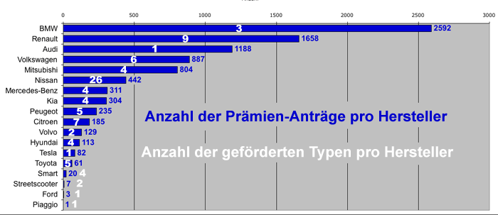 | Die meisten Prämienanträge wurden für drei Modelle von BMW gestellt, gefolgt von Renault mit neun Modellen. Audi schaffte es sogar mit einem einzigen Fahrzeugtyp – der Elektro-Version des A 3 – auf den dritten Platz. |