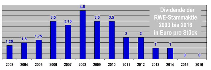Der RWE-Vorstand will den Aktionären zum zweiten Mal die Dividende streichen. Wie er am 22. Februar mitteilte, schlägt er für das Geschäftsjahr 2016 eine Aussetzung der Dividende für Stammaktien vor. Für Vorzugsaktien gibt es nur die satzungsgemäß vorgeschriebene Mindestdividende von 13 Cent pro Stück. Das ist genau derselbe Dividenden-Kahlschlag wie im Vorjahr (160205).