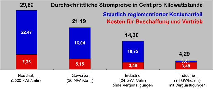 | Neben Steuern, Umlagen und Abgaben gehören auch die Netzentgelte zu jenen Teilen des Strompreises, die staatlich reglementiert sind (blau). Die Grafik verdeutlicht, wie gering damit jener Kostenanteil für Beschaffung und Vertrieb wird, der von den Erzeugern bzw. Lieferanten tatsächlich beeinflußt werden kann (rot). Sie zeigt ferner, wie stark der Staat die von ihm reglementierten Preisbestandteile für industrielle Großstromverbraucher absenkt, wodurch sich für diese der Preis pro Kilowattstunde von 14,20 Cent auf bis zu 4,29 Cent ermäßigt. Nähere Angaben dazu in der Tabelle. |