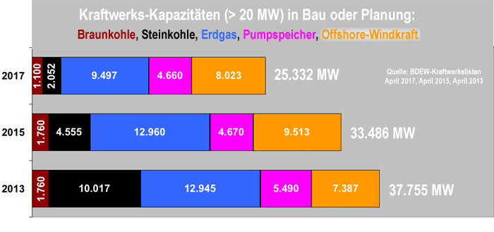 Die Auflistung aller bekannten Offshore-Vorhaben ergäbe indessen ein falsches Bild. Schon jetzt sind die hier angegebenen 6.733 MW für Anlagen im Planungsstadium insofern irreführend, als seit Anfang dieses Jahres alle Projekte durch den Flaschenhals des neu eingeführten Ausschreibungsverfahrens müssen. Dieser Flaschenhals ist überaus eng und läßt bis Ende 2021 gerade mal die Vergabe von 3.100 MW zu. Das ist weniger als die Hälfte jener Kapazität, die erforderlich wäre, um die in der BDEW-Liste aufgeführten Offshore-Windparks alle ans Netz zu bringen. Bei den folgenden Ausschreibungen, die ab November 2021 vorgesehen sind, wird der Flaschenhals weiterhin bestehen und jährlich nur 700 bis 900 MW durchlassen. Der Kapazitätszuwachs bei Offshore-Windstromerzeugung hängt somit nicht mehr in erster Linie von der Zahl der Projekte ab, sondern von den politisch-administrativen Vorgaben, die ihre Realisierung beschränken (siehe 170401).